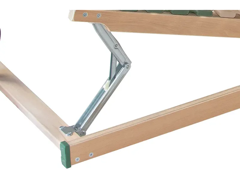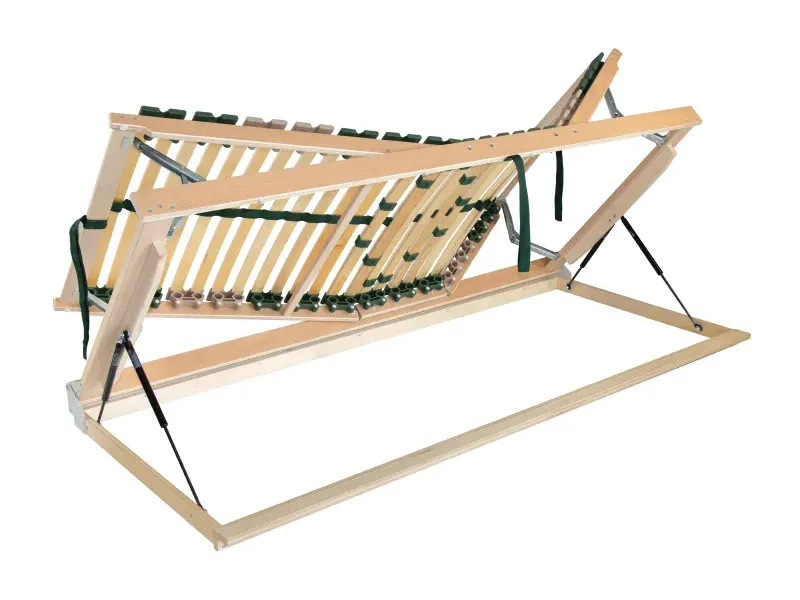 Pohodlný a odolný rošt s pouzdry uloženými nad bočnicí poskytuje vyšší komfort při spánku. Unikátní rošt 2v1 s více funkcemi nabízí jak pohodlné polohování, tak i boční odklápění pomocí pístu. Zdvih pomocí textilního úchytu usnadní každodenní manipulaci. Speciálně uložená výkyvná pouzdra zaručují vyšší nosnost a odolnost proti prudkému zatížení. Pružné lamely v 7 anatomických zónách se natáčejí a reagují na pohyb těla při spánku. Každá část těla je tak individuálně podepřena. Změkčení v ramenní oblasti je správnou oporou páteře při spánku na boku. Středový popruh zlepšuje stabilitu roštu. Posuvnými objímkami lze nastavit individuální tuhost v bederní části. Lamely opatřené folií zabraňují pronikání vlhkosti do roštu a usnadní údržbu roštu.