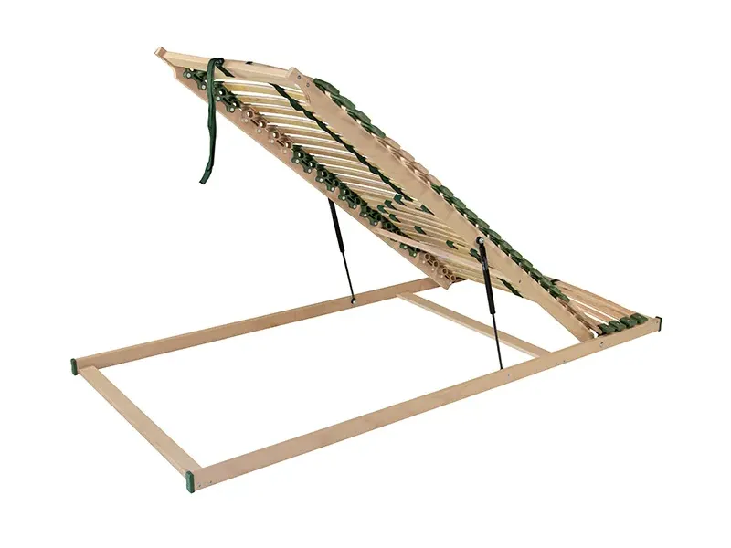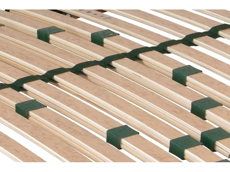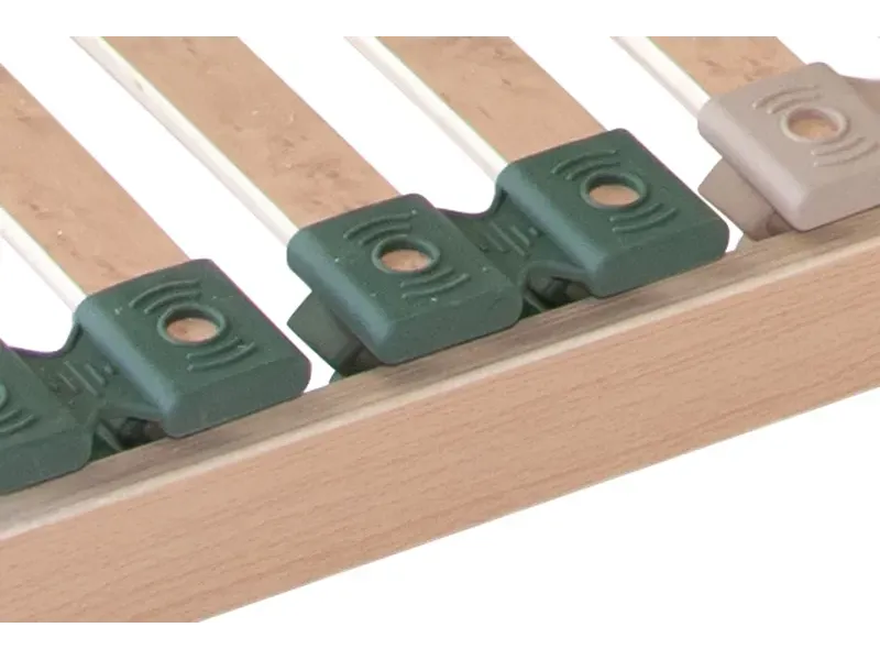 Pohodlný a odolný rošt s pouzdry uloženými nad bočnicí poskytuje vyšší komfort při spánku. Postelový rošt s výklopem nožní části pomocí pístu s přístupem do celého úložného prostoru. Speciálně uložená výkyvná pouzdra zaručují vyšší nosnost a odolnost proti prudkému zatížení. Pružné lamely v 7 anatomických zónách se natáčejí a reagují na pohyb těla při spánku. Každá část těla je tak individuálně podepřena. Změkčení v ramenní oblasti je správnou oporou páteře při spánku na boku. Středový popruh zlepšuje stabilitu roštu. Posuvnými objímkami lze nastavit individuální tuhost v bederní části. Lamely opatřené folií zabraňují pronikání vlhkosti do roštu a usnadní údržbu roštu.