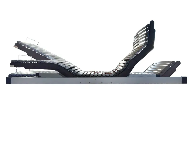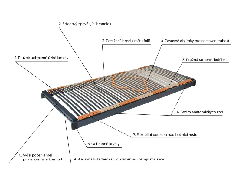 Jedinečný motorový rošt se 4 nezávislými pohonnými jednotkami a s funkcí MEMORY – do paměti ovladače lze uložit až 2 vaše oblíbené polohy. Díky vysokému počtu úzkých lamel (45 lamel) citlivě reaguje na každý pohyb těla a změnu polohy při spánku. Kapsy umístěné nad bočnicí zajišťují dvojité pružení (lamely i kapsy) po celé délce lamely, nejen v její středové části. Rošt lze napolohovat až do 16 variant poloh – individuální polohování hlavové, zádové, stehenní a lýtkové části. Extra ploché provedení s motorem uloženým v konstrukci rámu roštu umožňuje plné využití výsuvného úložného prostoru pod lůžkem. Mechanickým zdvihem a přidržením nožní části lze zajistit přístup do úložného prostoru pod lůžkem. Řídící jednotka funguje také jako zásuvka – umožňuje připojit až 2 elektrické spotřebiče k elektrické síti. V případě uložení ovladače do stojanu nastane jednorázové odpojení všech spotřebičů ze sítě a vy si tak můžete vychutnat ničím nerušený, zdravý spánek. Při nočním vstávání z postele se automaticky rozsvítí tlumené světlo s čidlem pohybu. Foliovaná povrchová úprava usnadňuje údržbu roštu a zabraňuje pronikání vlhkosti do roštu. Tento rošt je dodáván pouze s dálkovým bezšňůrovým ovládáním.