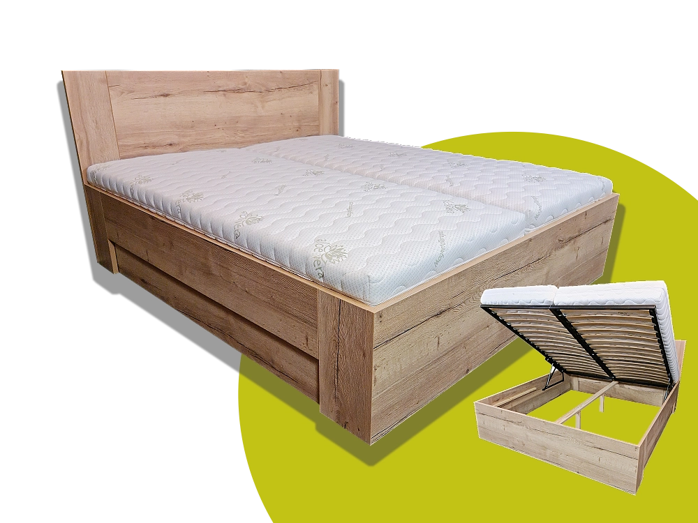 Postel je včetně úložného prostor a výklopného kovového roštu.