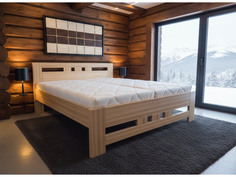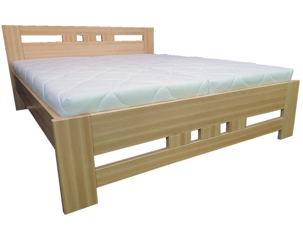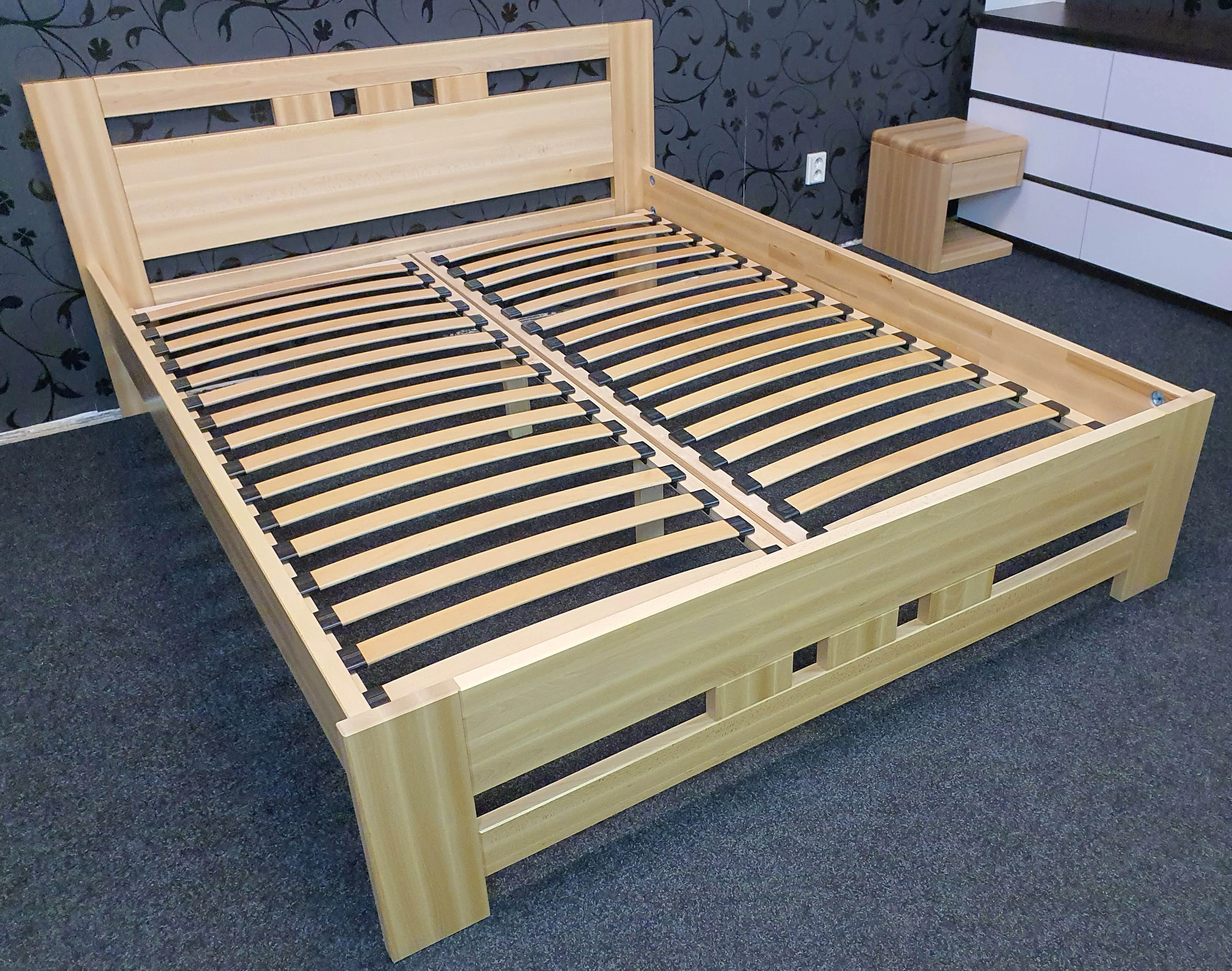 Masivní postel BUK VIKTOR z rostlého bukového dřeva lakovaná bezbarvým lakem. Velmi oblíbený typ designu čel postele, kde hlavní částí je plná výplň doladěna svislými příčkami a navýšení celkové výšky čel.