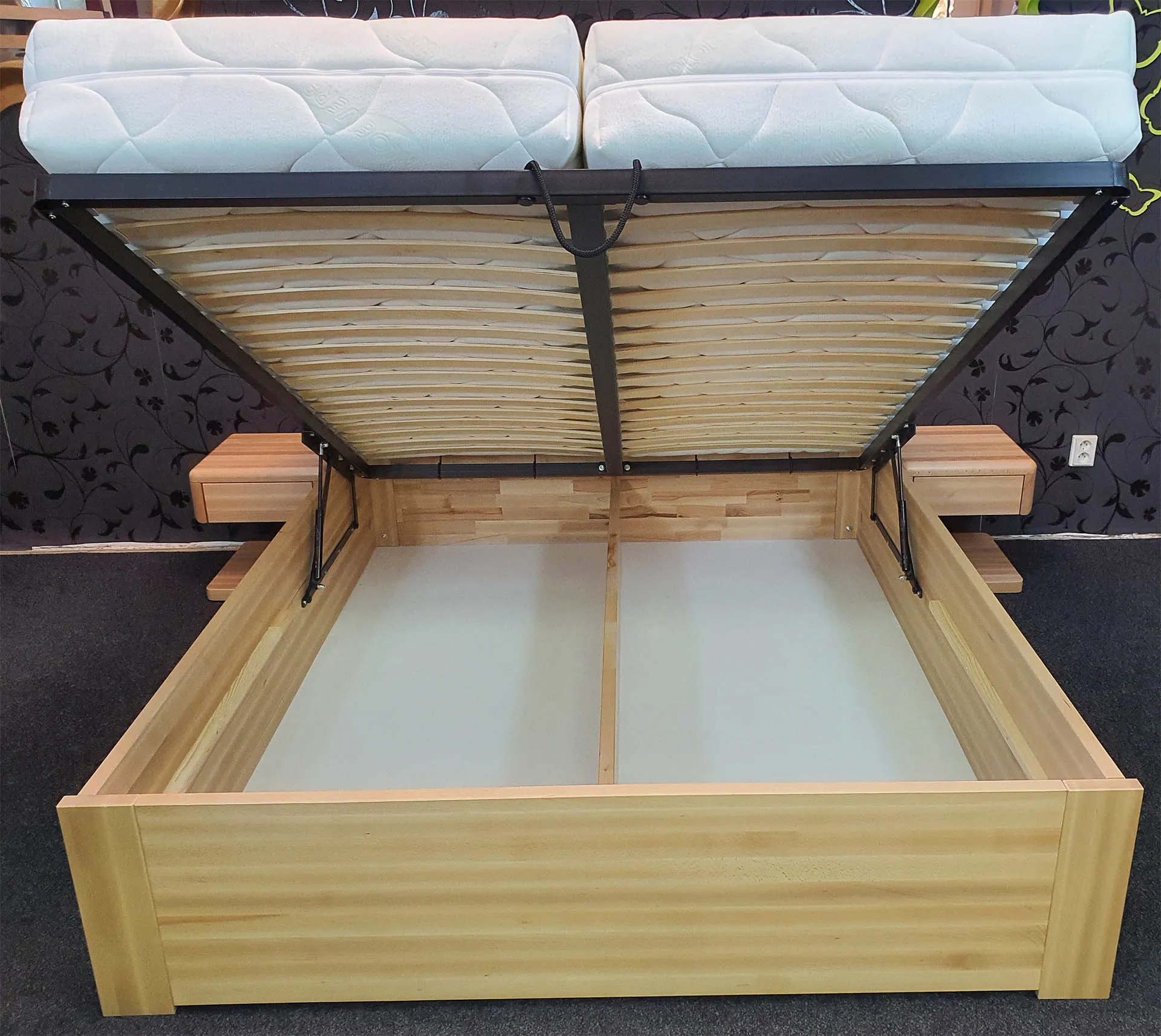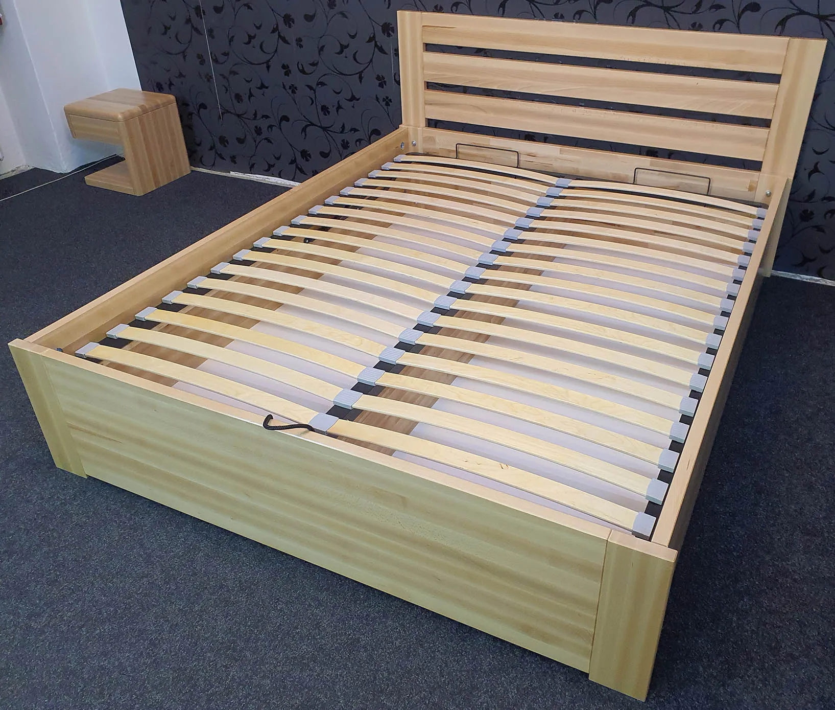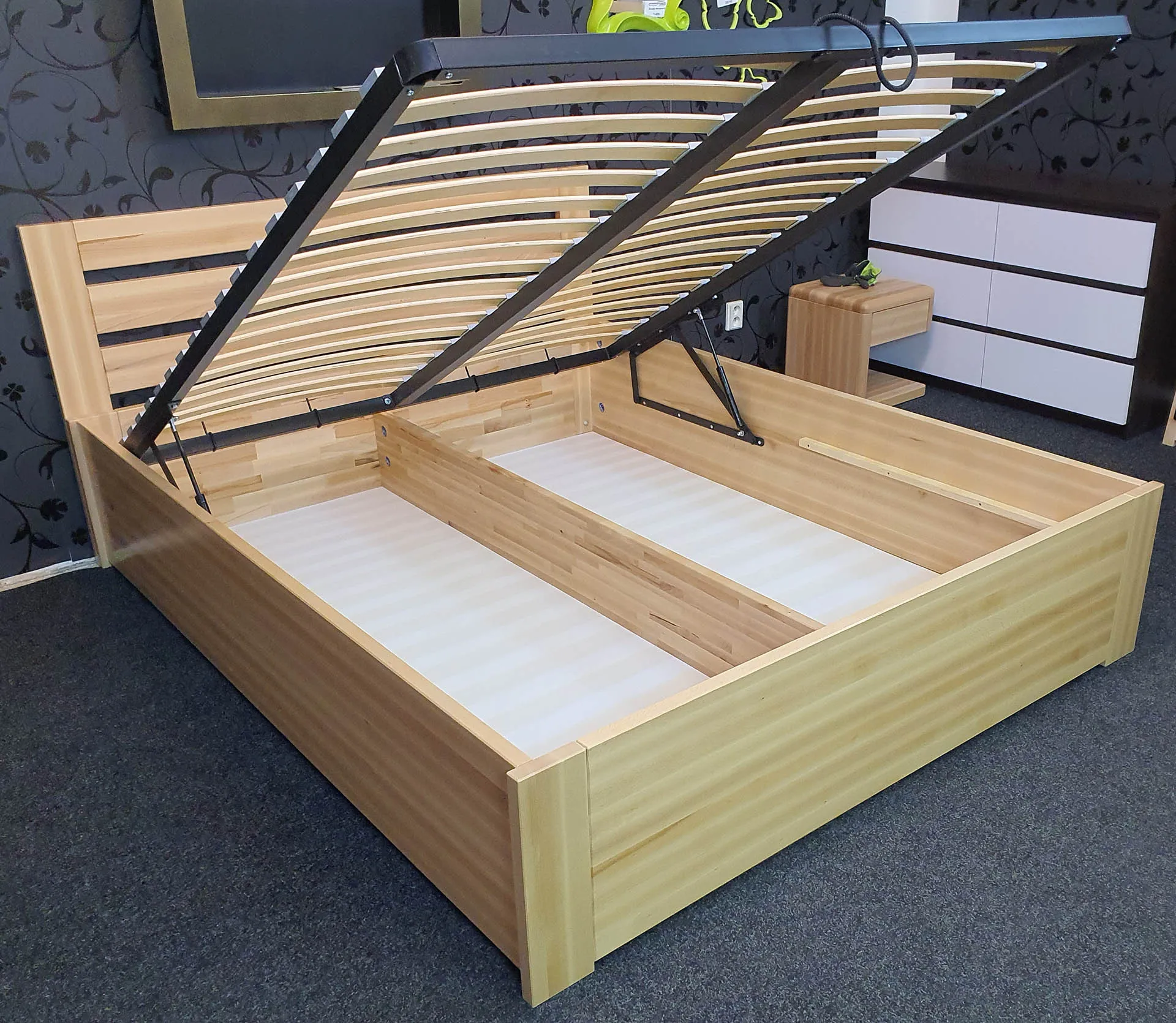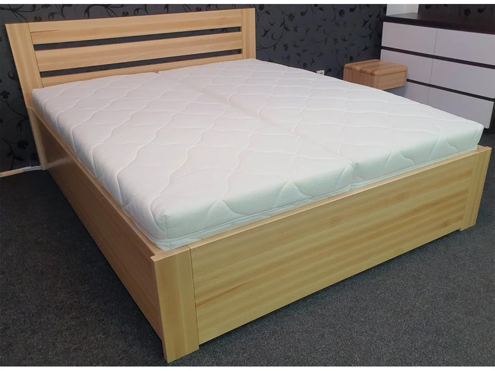 Masivní postel BUK SAMANTA BOX z rostlého bukového dřeva lakovaná bezbarvým lakem. Jedná se postel s úložným prostorem a výklopným roštem pro snadnější přístup do vnitřních prostor postele.