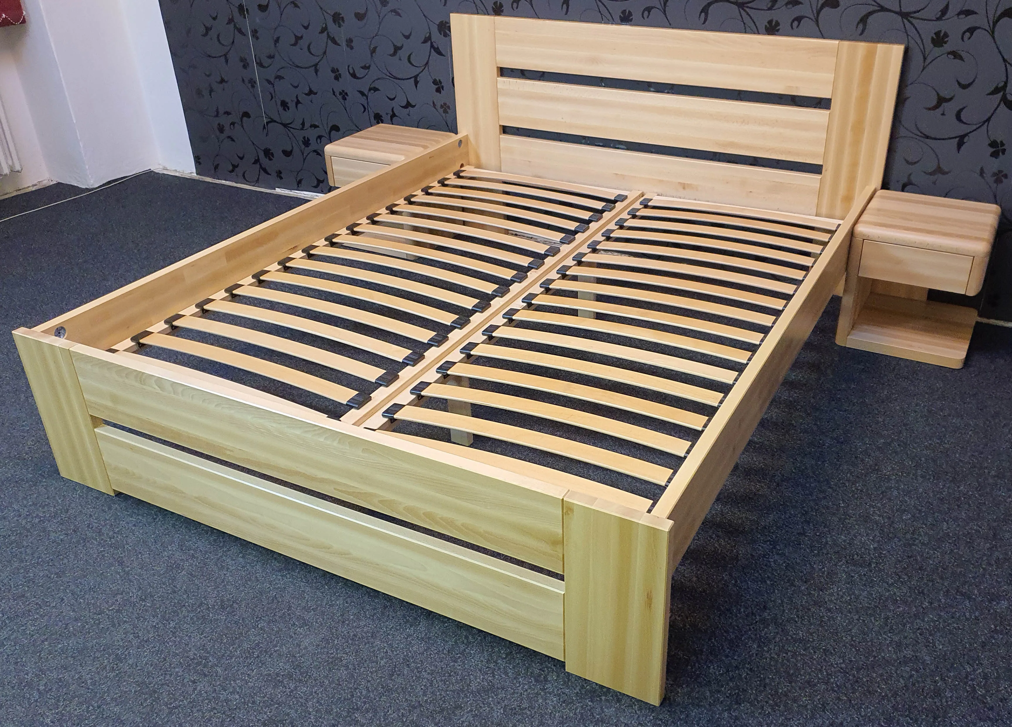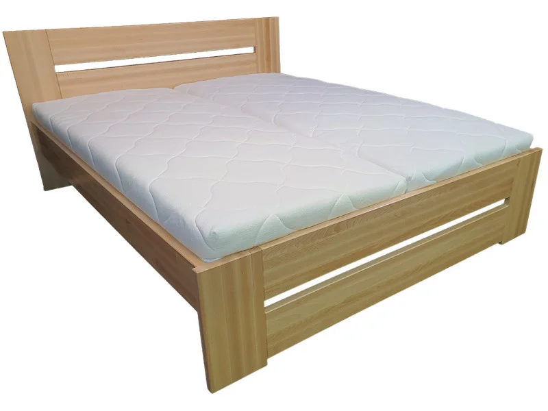 Masivní postel BUK RENATA z rostlého bukového dřeva lakovaná bezbarvým lakem. Postel vyniká plnými deskami v čelech za hlavou a nohách s mezerami které dodávají vzdušnost a jednoduchý design celé postele.