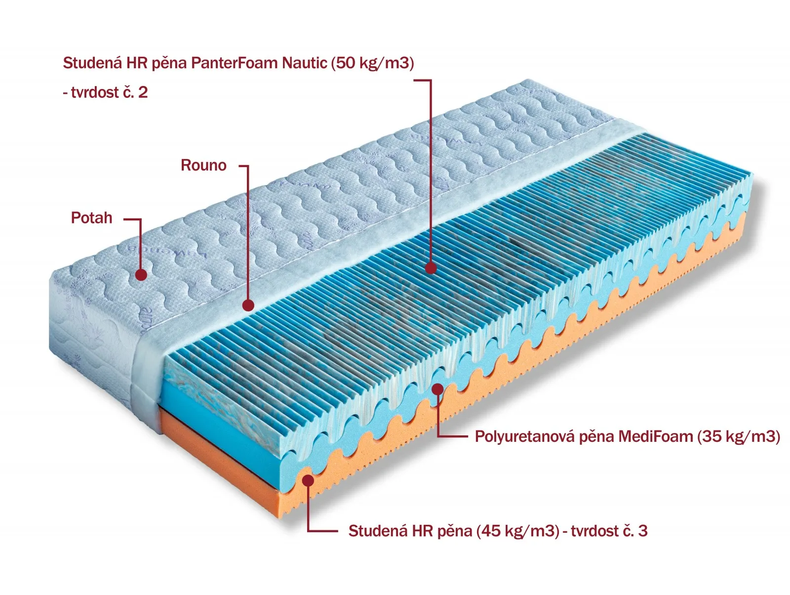 Partnerská matrace dvojí tvrdosti z velmi kvalitních studených pěn, které se vyznačují dlouhou životností. Pouhým otočením matrace zvolíte její tvrdost. Vrchní strana, s tvrdostí č. 2, je tvořena značkovou studenou pěnou PanterFoam Nautic, která přináší to nejlepší pro Váš spánek. Její vysoká hustota (50 kg/m3) zabezpečí nadstandardní odolnost. Díky speciální technologii výroby jsou její buňky otevřené, a proto velmi vzdušné.  Navíc má speciální antibakteriální úpravu, díky které je odolná proti bakteriím a roztočům. Pevné jádro z MediFoam pěny je tvarováno do souměrných vlnek, aby se mohlo přizpůsobit ležícímu tělu. Tvrdší stranu matrace (tvrdost č. 3) tvoří studená pěna, která je pro větší provzdušnění a pohodlí profilovaná do malých vlnek.