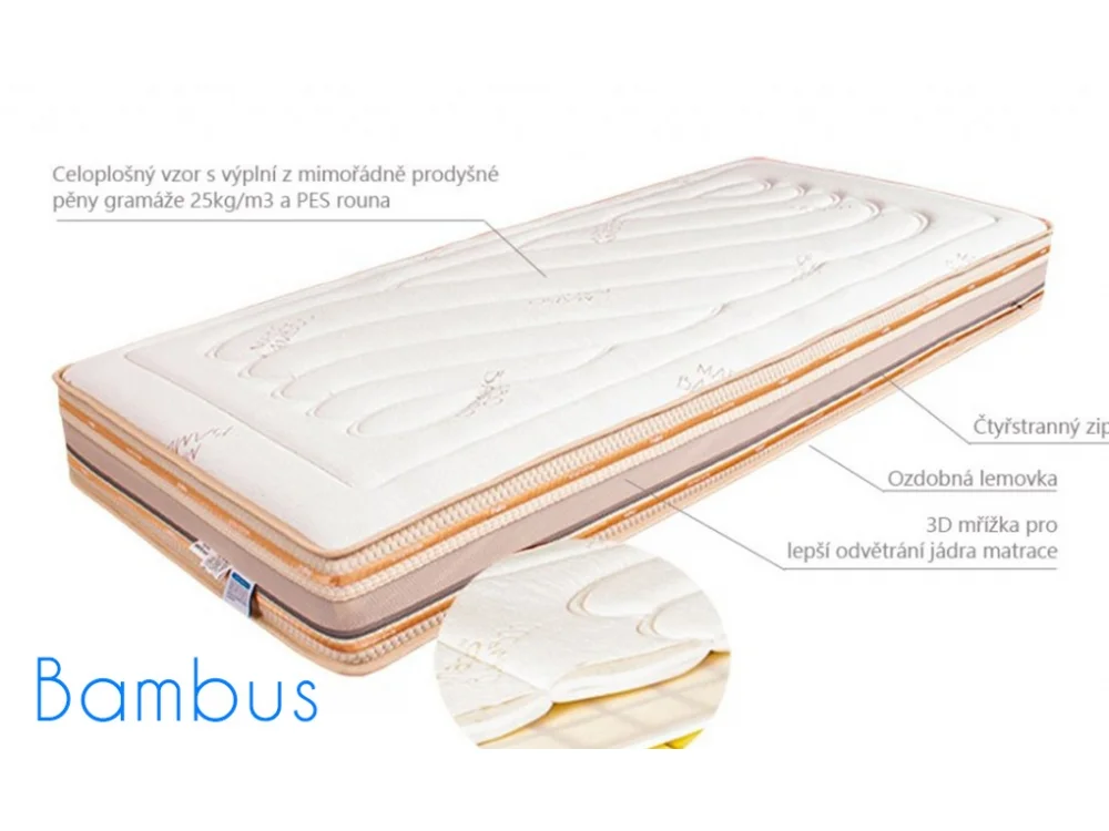 Potah BAMBUS - vrchní látka s bambusovým vláknem, jež je extrahováno přímo z bambusového stébla dodává potahu příjemnou měkkost a zároveň i vyšší pevnost. Bambusové vlákno dokáže ve větší míře přijímat vlhkost a následně při změně podmínek uvolňovat do ovzduší. Bambus vytváří také účinnou bariéru proti bakteriím.