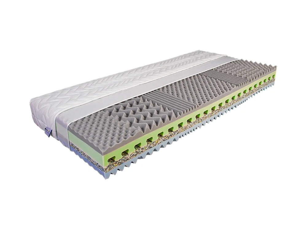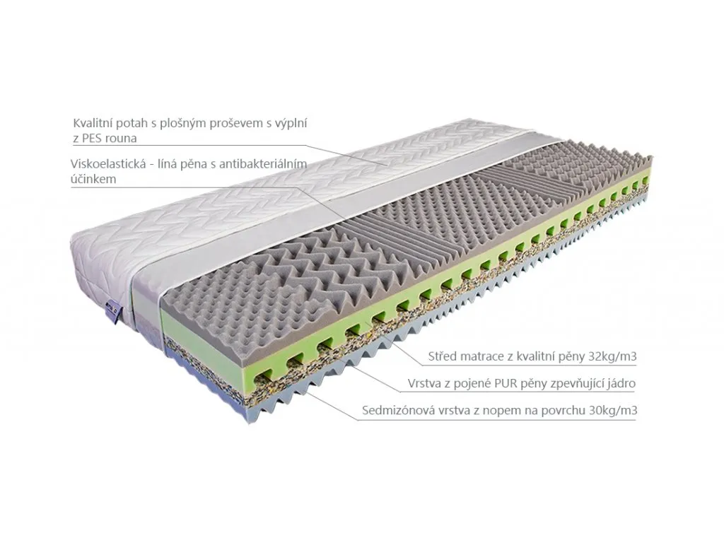 Kvalitní matrace s antibakteriální viskoelastickou pěnou nové generace. Jádro je složeno z elastické pěny gramáže 32 kg/m3 a velmi tuhé vrstvy z pojené PUR pěny. Na povrchu jsou vrstvy se sedmi-zónovým profilem, který pomáhá udržovat optimální prostředí mezi potahem a pokožkou. Antibakteriální viskoelastická pěna se strouhanou mědí 50kg/m3 chrání Vaši matraci před nežádoucími bakteriemi. Tužší a měkčí strana.