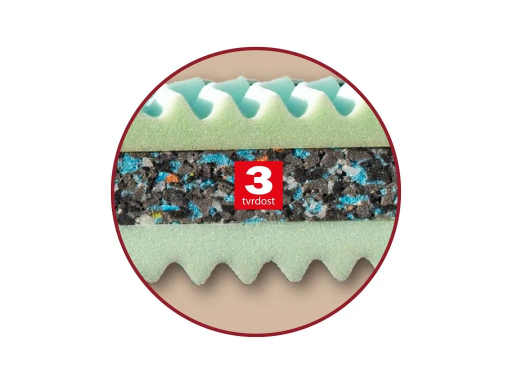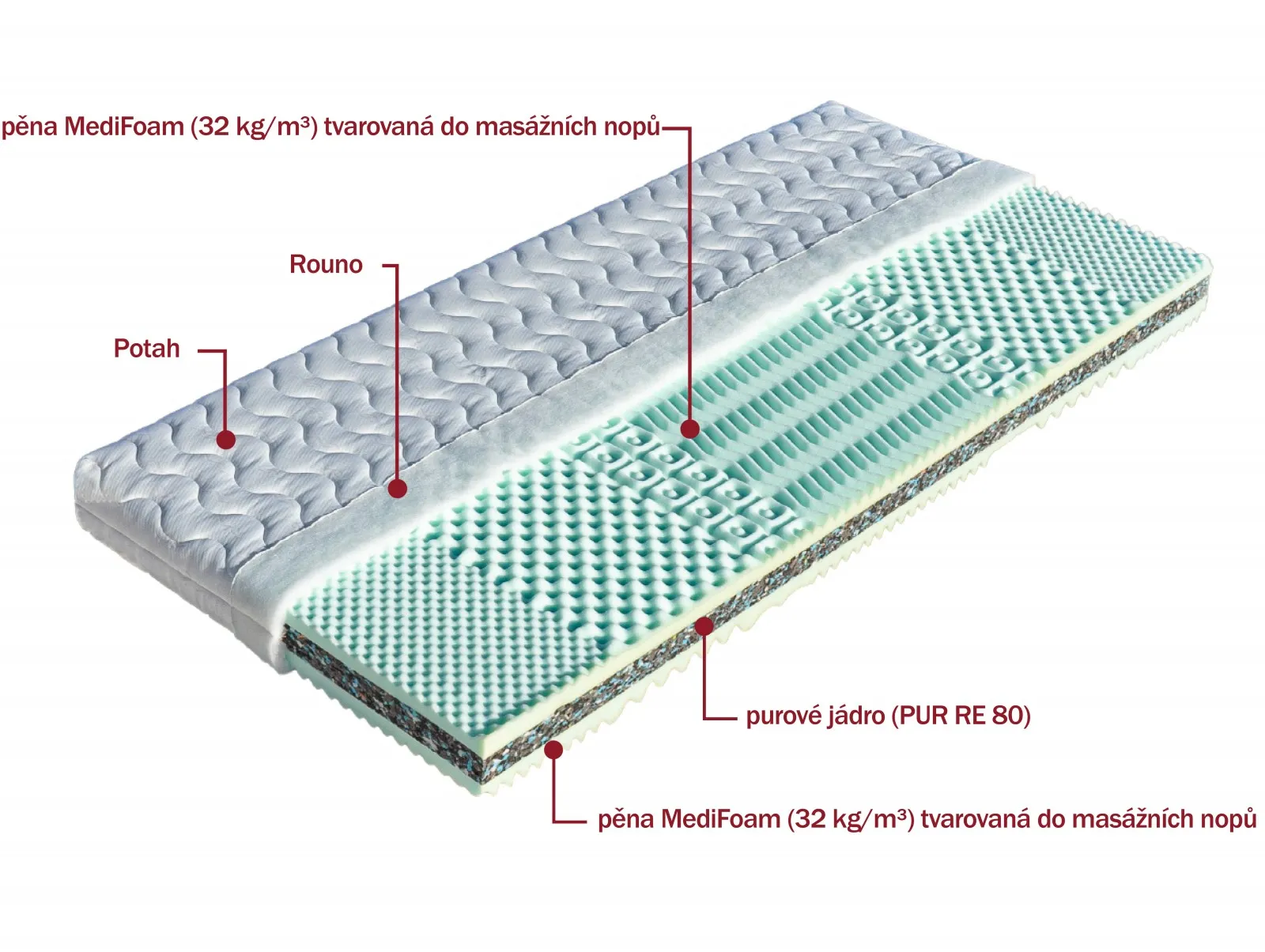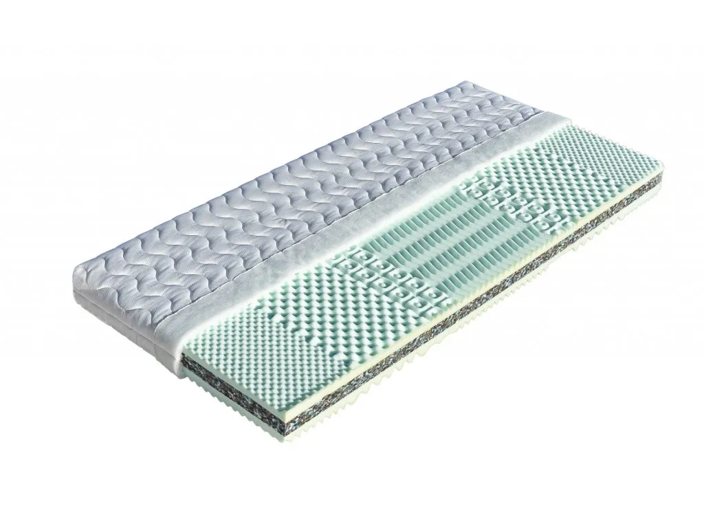 Klasická sendvičová matrace s jádrem z pojeného polyuretanu (PUR RE 80). Nosnou vrstvu matrace tvoří oboustranně pěna MediFoam (32 kg/m³) tvarovaná do masážních nopů.