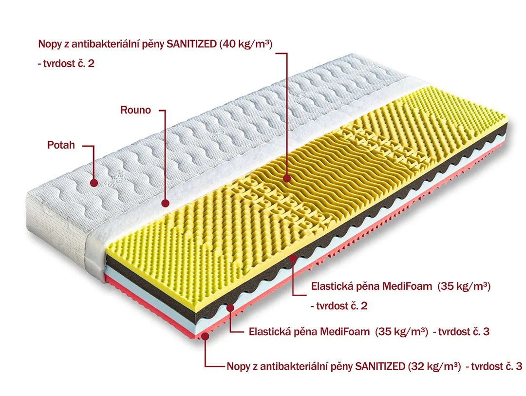 Potah Medicott– Značkový typ pleteného potahu, který svým speciálním složením zabraňuje tvorbě a usazování domácích roztočů a tvorbu plísní. Roztoči žijí v tmavém, vlhkém a málo odvětrávaném prostředí, a tomu přesně odpovídá vaše postel. Hlavní obživou pro roztoče jsou odpadávající buňky vaší kůže. Ty jsou rozkládány plísněmi a tak se stávají stravitelnými pro prachové roztoče. Plíseň samotná způsobuje alergie spojené s dýchacími symptomy. Medicott je účinná složka látky, která zabraňuje v bavlně nebo v látkách s bavlněným základem vzniku plísní a současně přežití prachových roztočů. Medicott má vynikající antibakteriální účinky, které jsou dosaženy bez přídavku chemických látek. Tajemství úspěšného fungování spočívá v odstranění nečistot z vláken přírodní bavlny, čímž se zamezí potencionálnímu domovu plísní. Potah má dlouhotrvající účinek při pravidelné údržbě. Potah je pratelný na 60°C. Složení potahu: 40% BAVLNA, 35% POLYAMID, 25% POLYESTER.