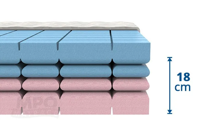 Matrace Marina je vyrobena z vysoce pružné a prodyšné pěny Eucapur zpracované do příčných pružin. Má 5 zón, nosnost 120 kg a výšku 18 cm. Skvěle se přizpůsobí tělu spáče.