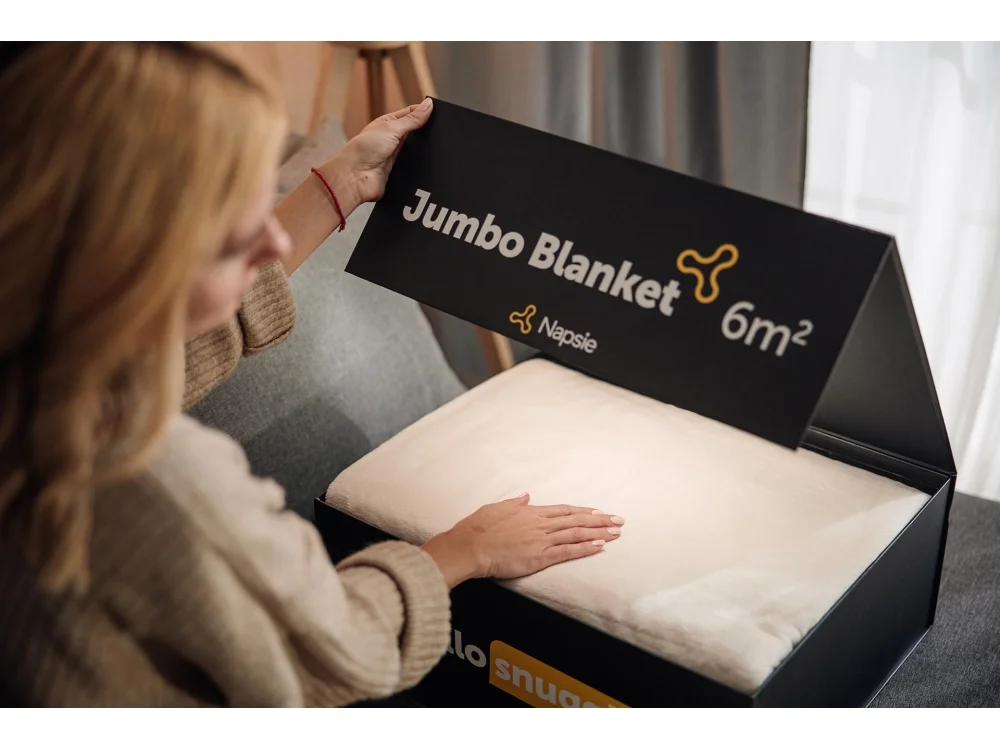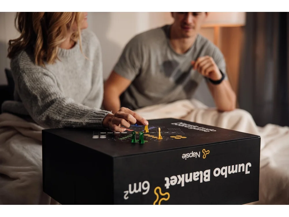 Napsie Jumbo deka je měkký kamarád na mazlení, který je dokonalým nadýchaným doplňkem každé domácnosti a měří neskutečných 6m2. Je to jedna z největších dek na trhu a přesto ji lze prát v pračce. Přijde vám v elegantní černé krabici s jedinečnou vychytávkou - na dně najdete potištěnou stolní hru: Člověče, nezlob se až pro 6 osob. Vezměte si kostky a hry mohou začít!