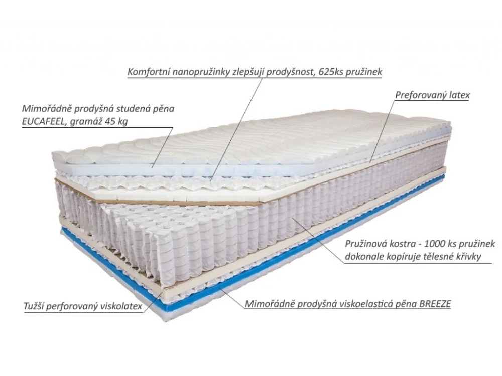 Uvnitř jsou pouze špičkové materiály jako je 15 cm vysoká taštičková pružina s vysokým počtem pružinek (1000 ks), hustě perforované latexové desky vysokou gramáží a optimální měkkostí. Změkčující nano pružinky pod povrchem umožňují lepší cirkulaci vzduchu. Horní vrstvy z výjimečných vysokogramážových pěn EUCAFEEL a BREEZE. Pěna EUCAFEEL je high-tech HR studená pěna (45 kg/m3) měkká jako peříčko s nekonečnou životností. BREEZE je viskoelastická pěna (50 kg/m3) s mimořádnou prodyšností. Byla naměřena 6x vyšší prodyšnost ve srovnání s běžnou viskoelastickou pěnou.