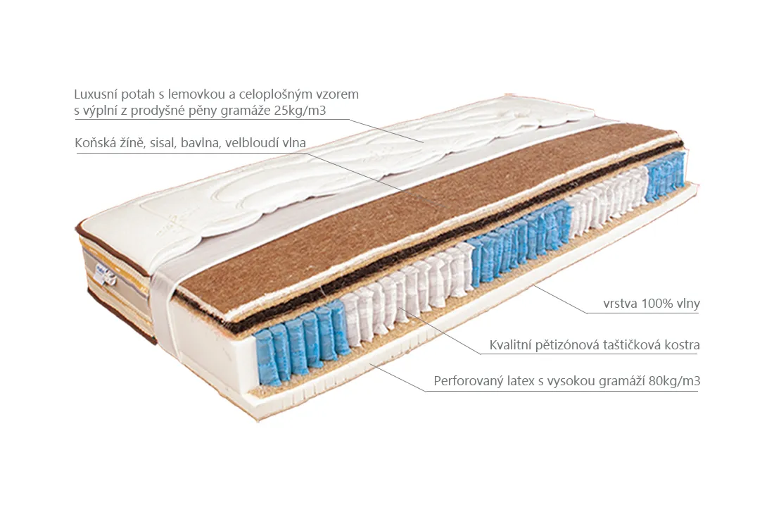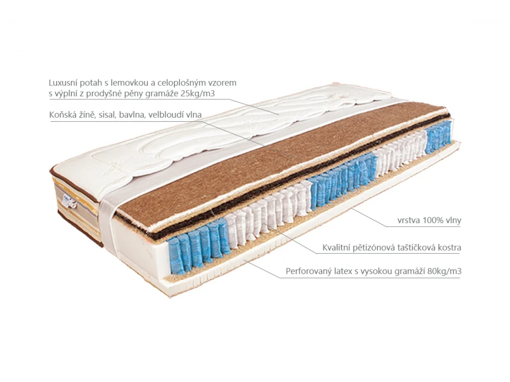 Přírodní materiály dodávají matraci specifické vlastnosti. Ovčí a velbloudí vlna fungují jako regulátor teploty, díky absorpci, případně uvolňování vlhkosti dokáží v létě chladit a v zimně hřát. Koňská žíně dokáže pojmout velké množství vlhkosti aniž by to bylo při doteku znát. Tuto vlhkost opět uvolní, když zrovna neležíte. Latexová vrstva působí navíc antibakteriálně, neboť přírodní latex vytváří nevhodné prostředí pro život roztočů. Všechny tyto vrstvy jsou mimořádně prodyšné, což poznáte při ležení na příjemném suchém povrchu.