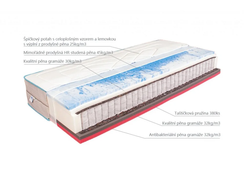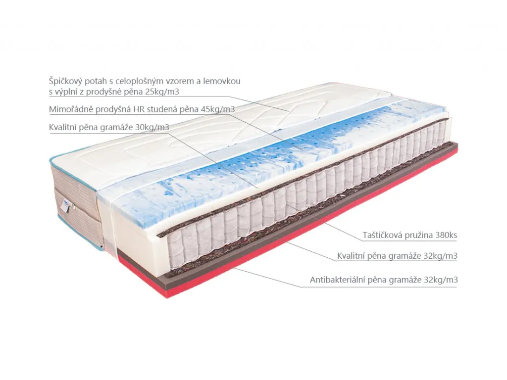 Velmi pohodlná pružinová matrace s antibakteriální úpravou. Výška matrace v potahu je 27 cm, což výrazně zvyšuje komfort ležení. Lehací vrstvy matrace jsou upraveny otvory tak, aby dokonale odváděly vlhkost od těla. Tvrdší strana z antibakteriální pěny gramáže 32kg/m3, měkčí strana je vytvořena mimořádně prodyšnou HR pěnou nové generace s gramáží 43kg/m3. Kvalitní taštičkové jádro s 380 ks pružinek. Jádro je chráněno separačním úpletem.