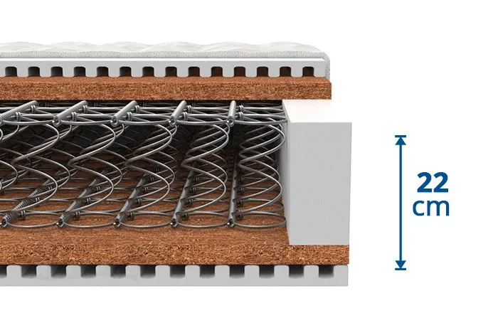 Kokosová pružinová matrace Monarcha díky výšce 22 cm usnadňuje vstávání z lůžka nejen seniorům. Tvoří ji systém pružin Bonell, studená pěna a deska z kokosových vláken.