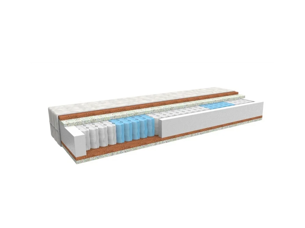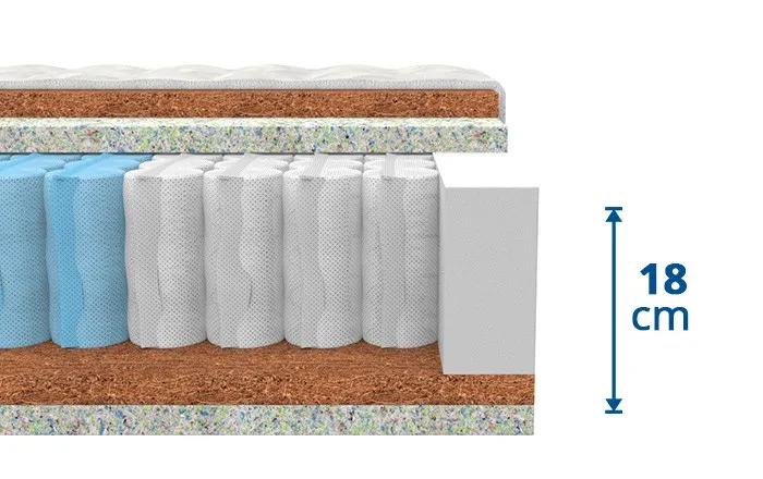 Taštičková matrace Ergonomy Plus má vysokou nosnost 150 kg, výšku 18 cm a vynikající ortopedické vlastnosti, díky nimž budete po nočním spánku jako znovuzrozeni. Je zhotovena z jádra, které tvoří taštičkové pružiny. Až 400 pružin umístěných v textilním obalu reaguje samostatně na tlak těla, zvyšuje bodovou pružnost matrace a tím umožňuje optimální rozložení hmotnosti spícího. Horní vrstva matrace je tvořena kombinací desky z lehčené pěny a desky z kokosového vlákna. Tyto materiály vám umožní odpočinout si na letní nebo zimní straně. Ulehnutí na tuto luxusní matraci znamená zásadní krok ke klidným nocím a pohodovému vstávání.
